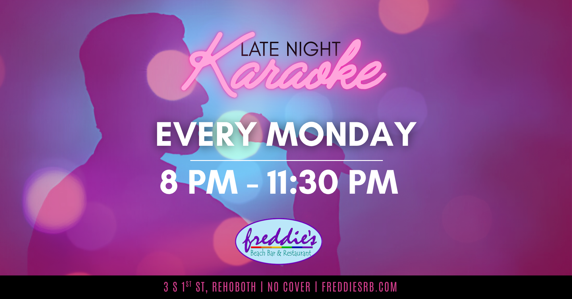 Back to All Events Late-Night Karaoke Monday, June 29, 2026 8:00 PM 11:30 PM Freddie's Beach Bar - Rehoboth Beach 3 South 1st Street Rehoboth Beach, DE, 19971 United States (map) Google Calendar ICS Every Monday, late-night karaoke is calling! Grab the mic, request your favorite songs, and sing your heart out — it’s that simple and that fun. Don’t miss it!