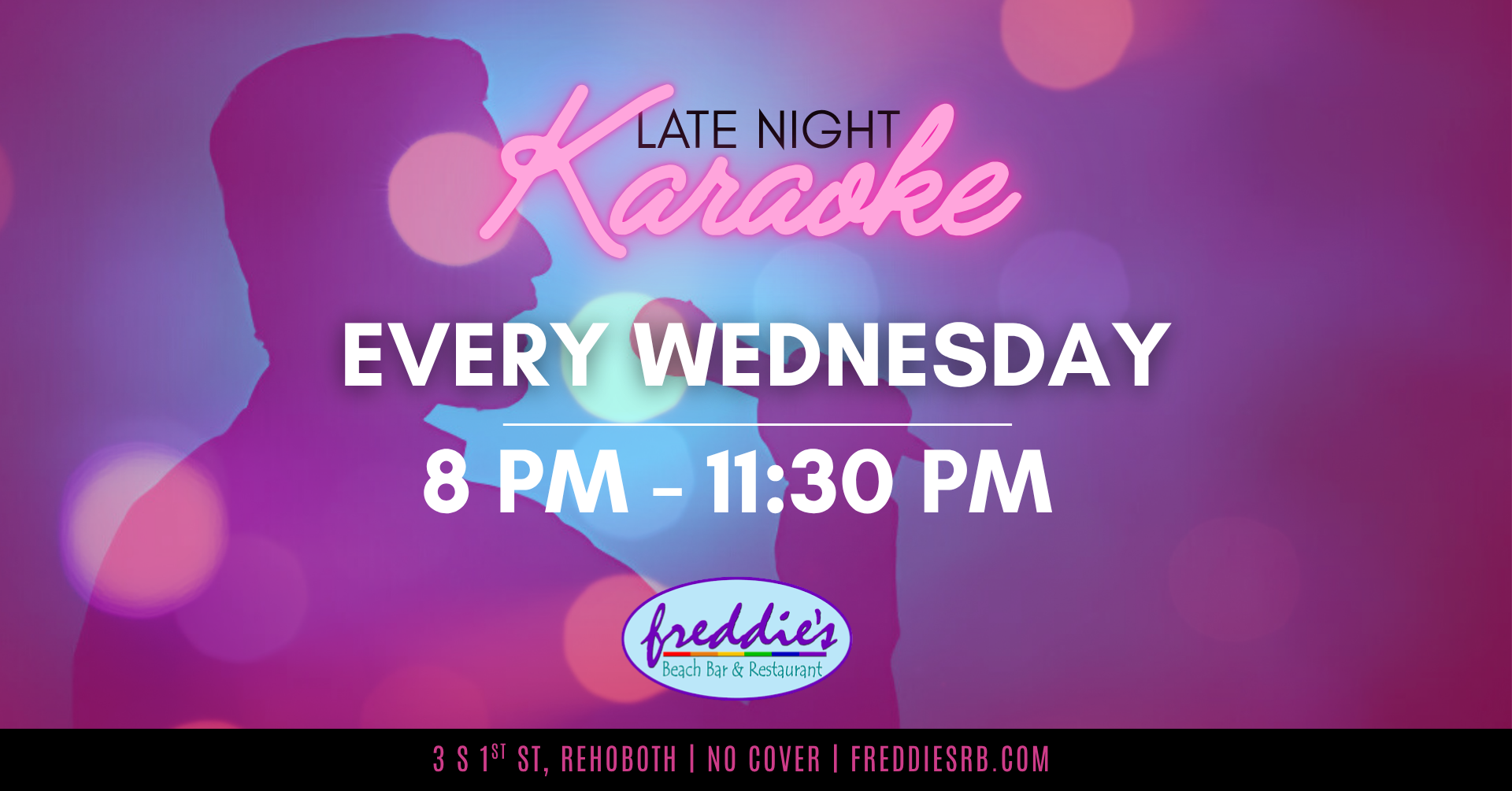 Back to All Events Late-Night Karaoke Wednesday, May 20, 2026 8:00 PM 11:30 PM Freddie's Beach Bar - Rehoboth Bar 3 South 1st Street Rehoboth Beach, DE, 19971 United States (map) Google Calendar ICS Every Wednesday, late-night karaoke is calling! Grab the mic, request your favorite songs, and sing your heart out — it’s that simple and that fun. Don’t miss it!